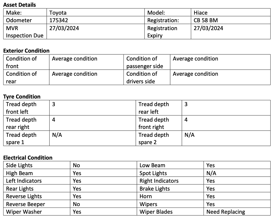 If you manage a fleet of remote vehicles we can offer an onsite unbiased inspection of your vehicles general condition and readiness. Our full reports include registration and inspection due dates and can be tailored to suit your specific requirements.